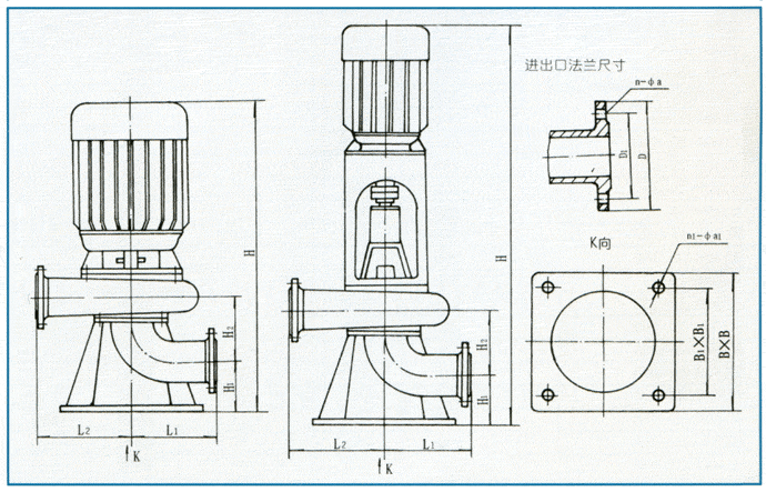 該系列泵具有兩種結(jié)構(gòu)形式,一是電機與泵直接同軸,二是采用聯(lián)軸器聯(lián)接,電機采用標(biāo)準(zhǔn)立式電機。其結(jié)構(gòu)圖如下,每種結(jié)構(gòu)形式具有兩種底座連接形式,一是進口水平吸入,具有轉(zhuǎn)角功能,可根據(jù)使用要求,進出口安放成0°、90°、180°、270°,便于管路連接,二是進口軸向吸入,便于立式安裝。